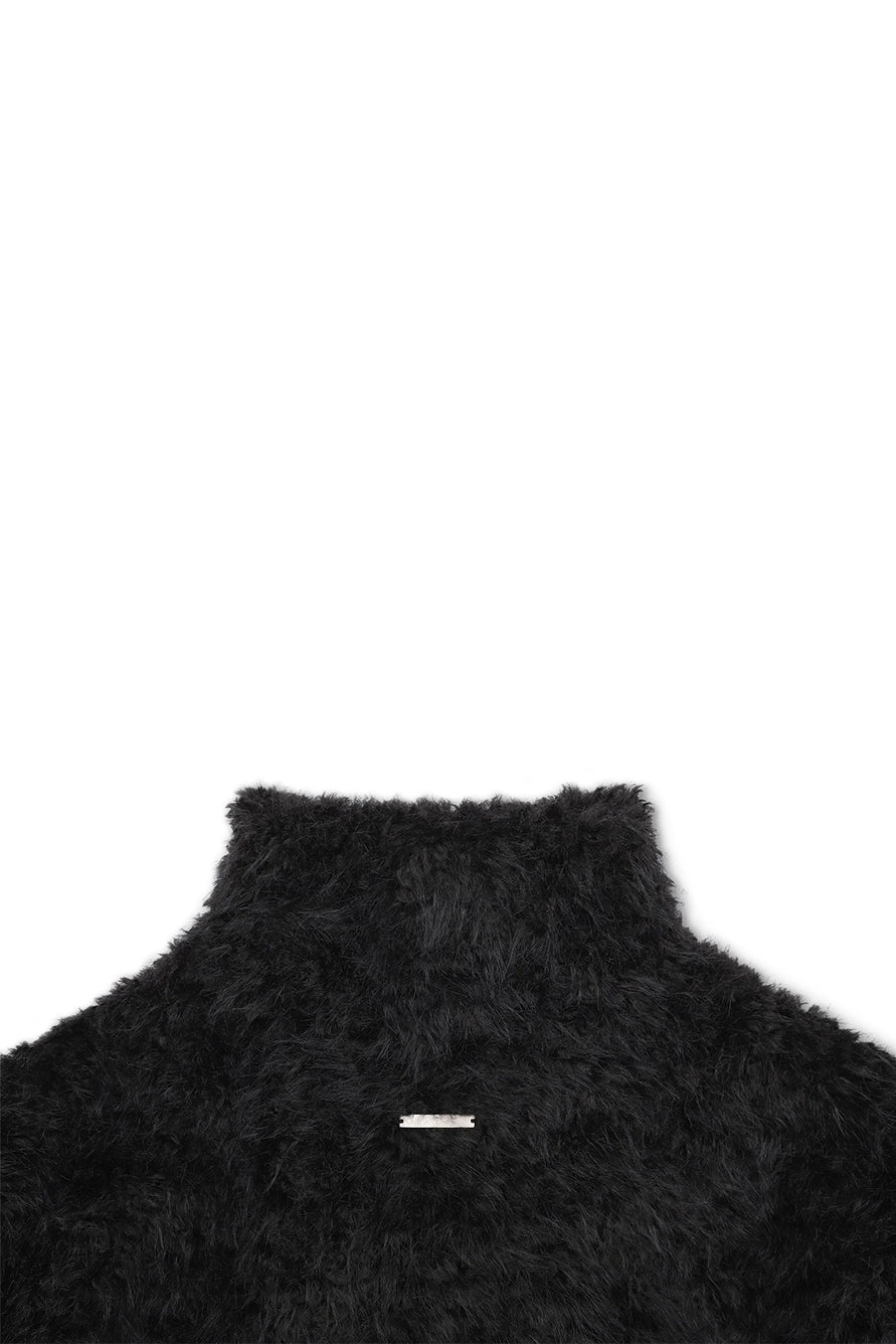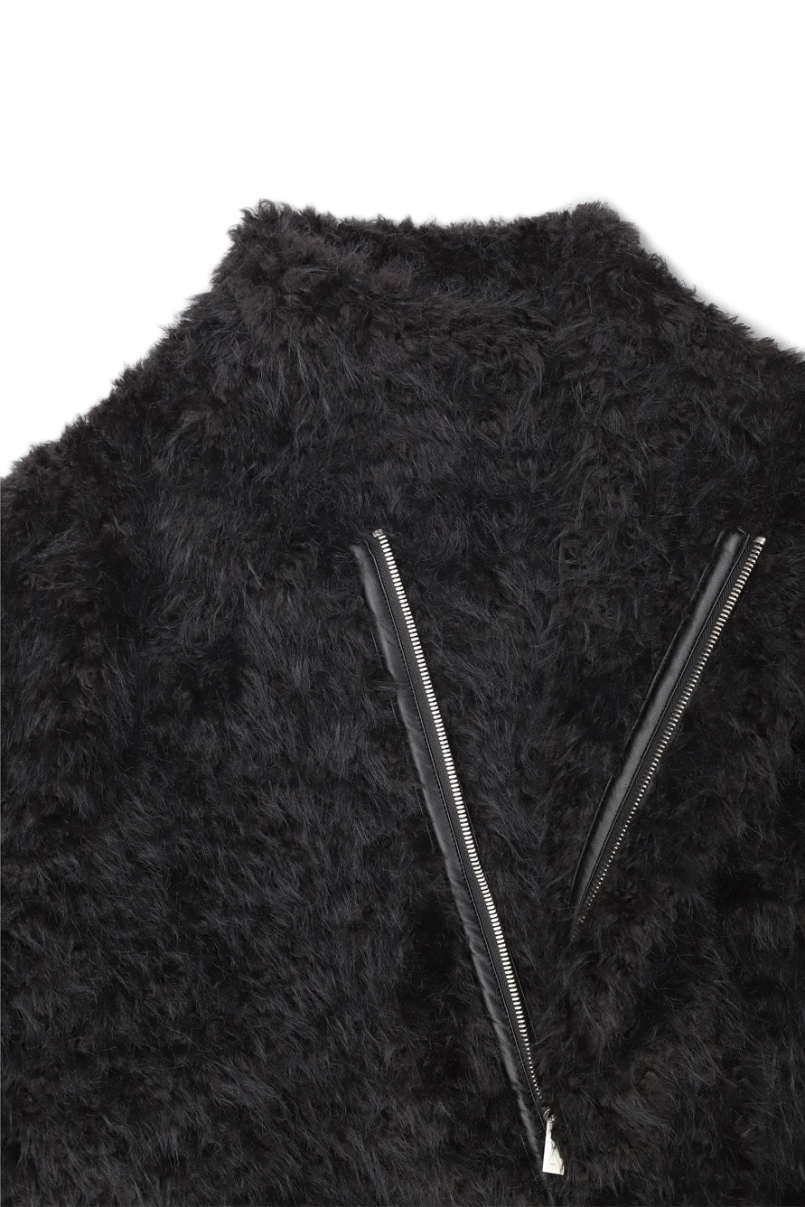 Black oversized jacket in faux fur, featuring an adjustable bottom with a drawstring. The soft lining provides added comfort, while the design includes a diagonal hidden metallic zipper, elastic waistband, and a high neckline for extra warmth.