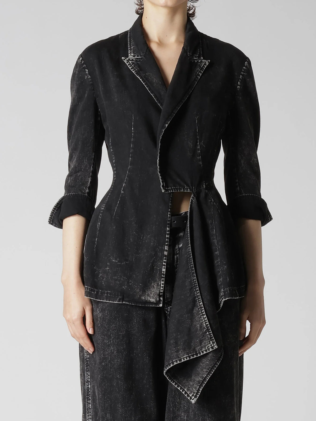 This 60-ounce denim jacket showcases a unique chemistry-induced wash effect, creating a distinctive gradation. The body is fitted at the waist, with additional fabric adding movement to the design. Its unconventional and eye-catching pattern makes this piece a standout addition to any wardrobe.